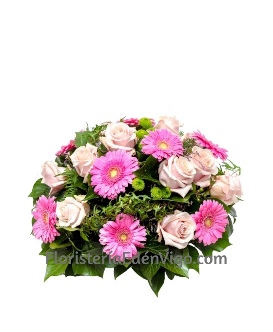 Bonito y elegante, este Centro Funerario Esperanza de flores para entierro para entrega en los Tanatorios de Vigo. Es un centro de flores para tanatorio, de flores para difuntos variadas, en tonos rosados, confeccionado con rosas, gerberas, margaritas de botón verde y verdes variados que le dan al centro un toque dulce y delicado. Nuestros centros de flores para fallecido se envían a los Tanatorios como muestra de cariño, aprecio y acompañamiento para la familia de la persona fallecida. Este centro de flores para funeral es un producto de total calidad, con flores frescas suministradas todos los días por nuestros proveedores, tanto nacionales como internacionales. Por lo que lo elaboramos lo más parecido posible o a gusto del cliente. Nuestros trabajos de flores para funeral, están siempre realizados con flores para difuntos y verdes de primera calidad. Estas flores para entierro son suministrados tanto por proveedores nacionales, como internacionales. Son centros de flores para fallecido efectuados de forma totalmente artesanal por nuestros floristas. Somos floristas profesionales, formados, por lo que su centro de flores para tanatorio quedará bonito y elegante.